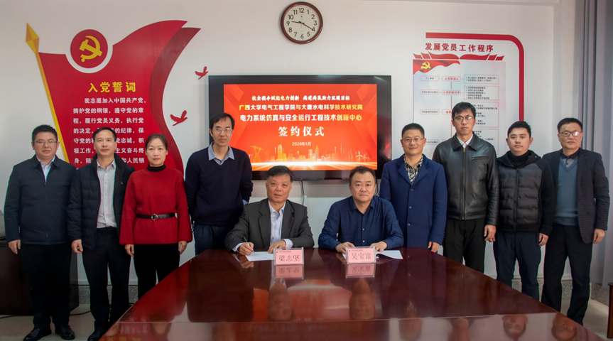 1月8日上午,广西大学电气工程学院与大唐水电科学技术研究院战略合作签约仪式在学院302会议室举行。学院党委书记梁志坚,党委副书记、副院长张镱议,大唐水电科学技术研究院党委书记、执行董事吴宝富,副院长张海库出席活动。学院党委书记梁志坚主持签约仪式。 签约仪式现场 梁志坚书记欢迎吴宝富书记一行到访,双方围绕科研合作、人才联合培养、重点实验室共建等核心议题深入交流。他表示,校企优势融合是科技创新与成果转化的关键,未来将聚焦新型电力系统等重点方向联合攻关,携手申报各级科技项目与创新平台,深化产学研融合。党委副书记、副院长张镱议介绍了学院发展历程、学科优势及"十五五" 规划,并指出电气工程学院拥有多个国家特色与一流本科专业建设点,具备完整的学士至博士后人才培养体系,建有多级科研平台,在新型电力系统等领域成果丰硕。 吴宝富感谢学院在人才培养、科研攻关等方面给予的支持与帮助,介绍了研究院在水电工程建设、新能源开发利用、智能运维升级、标准体系构建等方面开展的工作和取得的成效——作为大唐集团唯一以水电和新能源为研究主体的科研技术保障单位,该院拥有高素质科研团队与完善的技术验证体系,承担多项国家级、省部级重点研发项目,主编参编多项国际及国家行业标准,专利与科研成果转化成效显著,工程实践与技术研发能力强劲。 梁志坚、吴宝富代表双方签署战略合作协议,并为“电力系统仿真与安全运行工程技术创新中心”揭牌。根据协议,双方将进一步深化产学研协同合作,在联合技术研发与成果转化、共建人才培养与就业基地、推进重点实验室建设与资源共享等方面开展全方位合作。 此次战略合作协议的签署,是校企双方响应国家创新驱动发展战略的重要举措,标志着我院在产学研融合领域迈出实质性步伐。未来,我院将加速推动科技成果向现实生产力转化,培养高素质专业技术人才,为新型电力系统建设与"双碳"目标实现注入强劲动力,书写校企合作共赢的崭新篇章。 电气工程学院各部门相关人员,大唐水电科学技术研究院科研管理、技术研究骨干及顾问专家参加签约仪式。