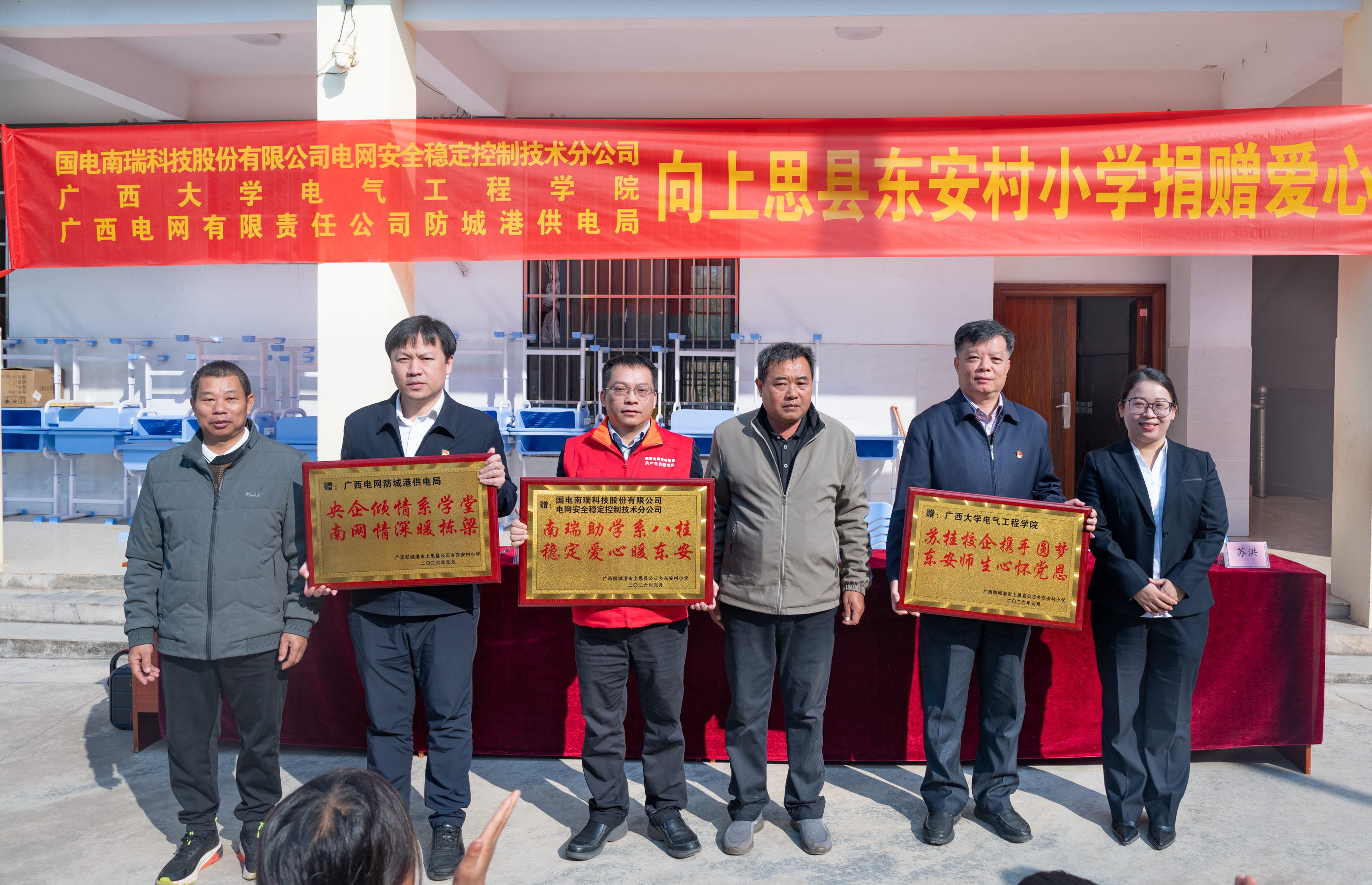 近日,我院联合国电南瑞科技股份有限公司电网安全稳定控制技术分公司(以下简称“国电南瑞稳定公司”)、南方电网广西防城港供电局,赴上思县东安村小学、宁明县那楠乡中心小学开展爱心助学活动。校企三方以物资捐赠、知识分享、交流互动等形式,为乡村教育发展注入温暖力量,以实际行动助力乡村振兴。